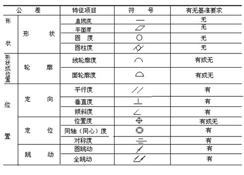標(biāo)準(zhǔn)gb/t1182-1996《形狀和位置公差》中規(guī)定,形狀和位置公差共有14個項目,其公差 征項目的名稱及符號見下表。